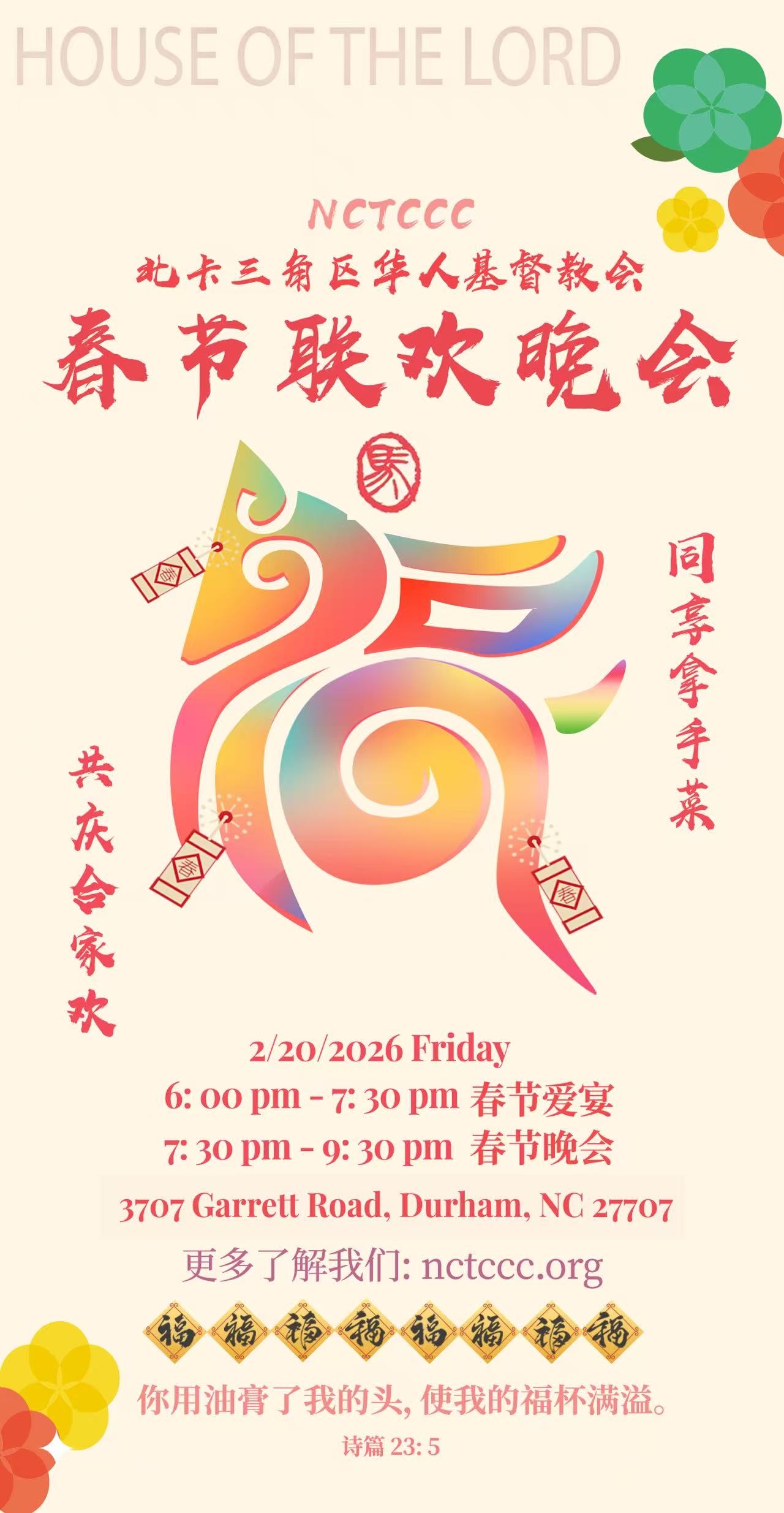 2026 TCCC 春节晚会 Date: February 20, 2026 Place: 北卡三角区华人基督教会, 3707 Garrett Road, Durham, NC 27707 Description
